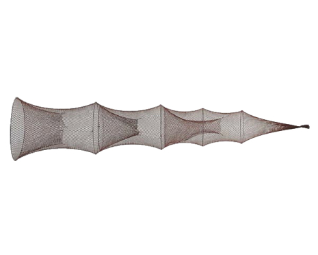 Ålryssja i mycket hög kvalitet som består av två ålryssjor med en 5 meter mittarm som förbinder de bägge ryssjorna. Varje ryssja är 1.95 meter lång. Knutlöst nät i brun färg. OBS, bilden visar endast en enkel ryssja.